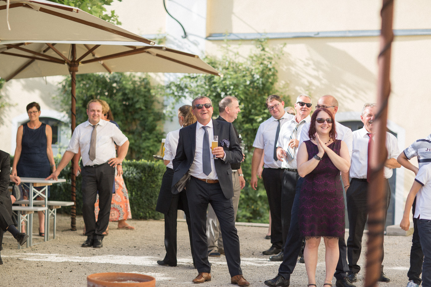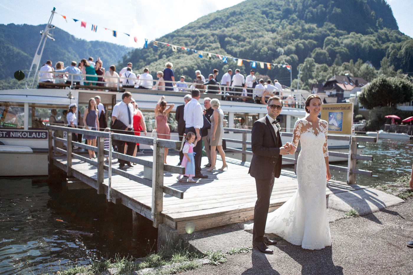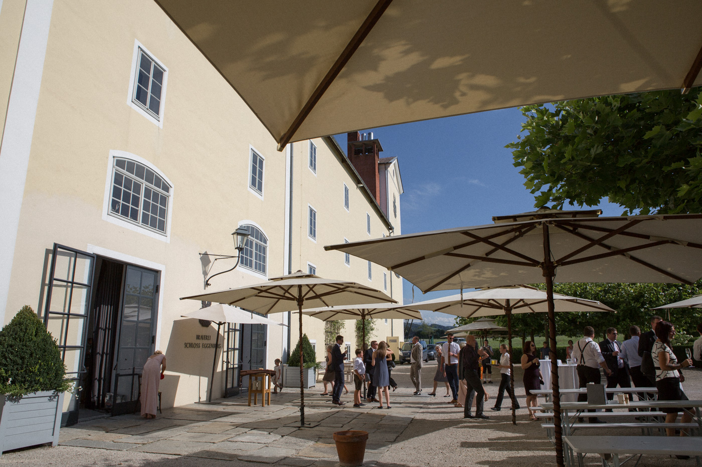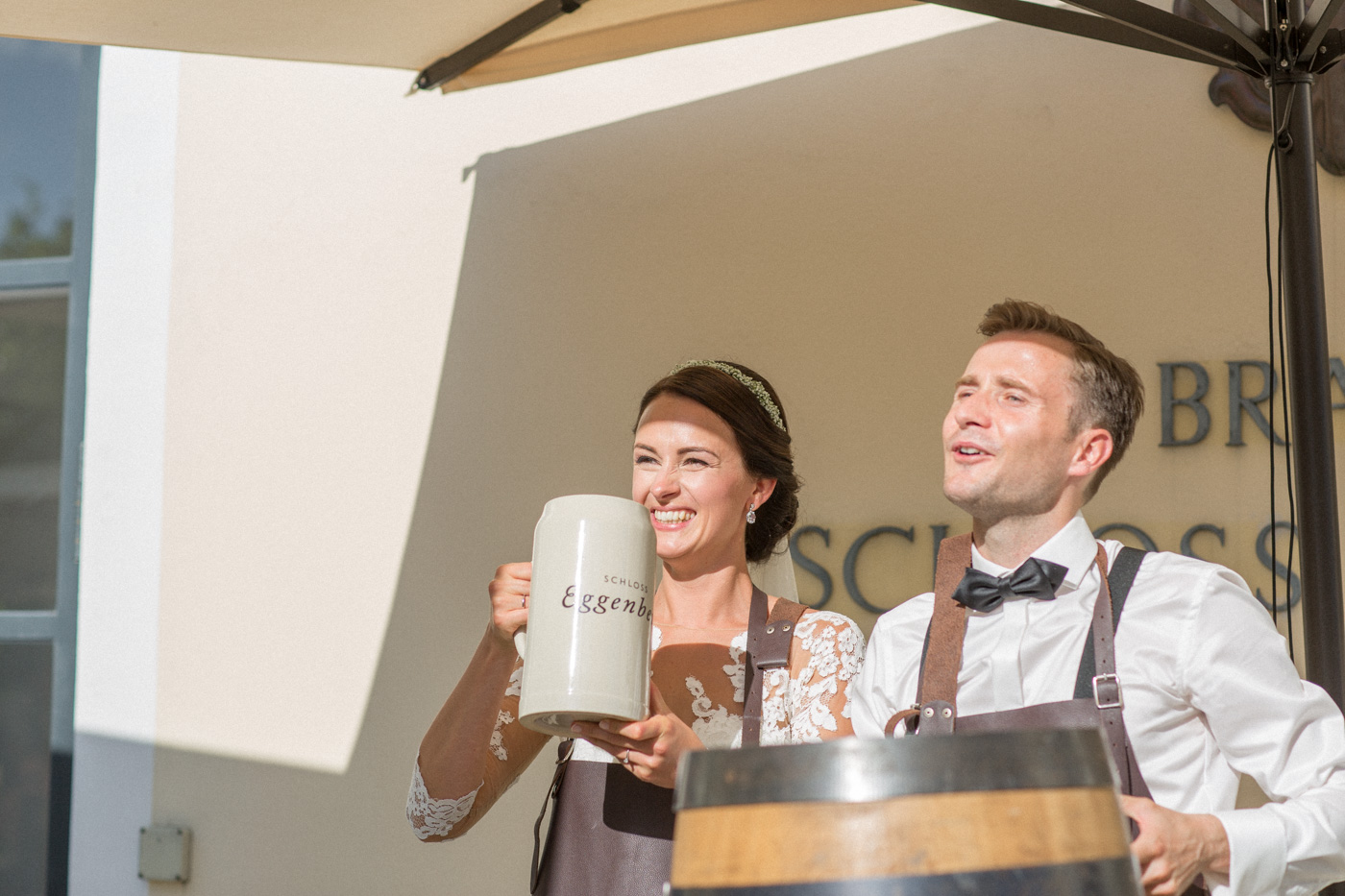 Während sich vor allem Katharina zu Hause so richtig fein und schick machte, wurden schon die Detailfotos in der Kamera festgehalten. Auf der anschließenden Fahrt nach Traunkirchen in die Kirche konnte man noch einmal ein wenig in sich gehen und vor allem die Ruhe für den anstehenden großen Moment genießen. Die Kirche war sehr berührend und emotional. Nach der Messe ging es zum Steg mit herrlichen Blick auf den See und auf den Traunstein und anschließend auf ein Schiff. Die Schifffahrt von einer Stunde wurde mit einem geselligen und schönen Sektempfang begonnen. Als das Brautpaar und die Gäste wieder ankamen, ging es dann nach Vorchdorf zum Schloss Eggenberg. Eine wunderschöne Kulisse und eine noch schönere Dekoration erwartete vor allem das Brautpaar. Die perfekte Location für Familienfotos. Diese wurden bei wunderschönem Sonnenschein natürlich auch geschossen. Eine solche Location muss natürlich auch direkt für romantische Bilder von Kathi und Patrick genutzt werden. Entsprechend haben wir auch gleich das Paarshooting realisiert. Doch dann sollten Brautpaar und Gäste erst einmal Zeit zum Feiern und essen haben. Das Schloss Eggenberg ist für Naturliebhaber eine hervorragende Kulisse. Alles ist grün und einfach ruhig. Die idealen Bedingungen für einen gemeinsamen Start in die Ehe. Aber auch Liebhaber eines kühlen Bieres werden in der hauseigenen Brauerei sicherlich auf die Kosten kommen. Ein Highlight das Schloss Eggenberg bietet, ist der Bierfassanstich für Braut und Bräutigam. Romantisch und dennoch sehr zünftig lässt es sich auf dem Schloss Eggenberg auf jeden Fall feiern.
