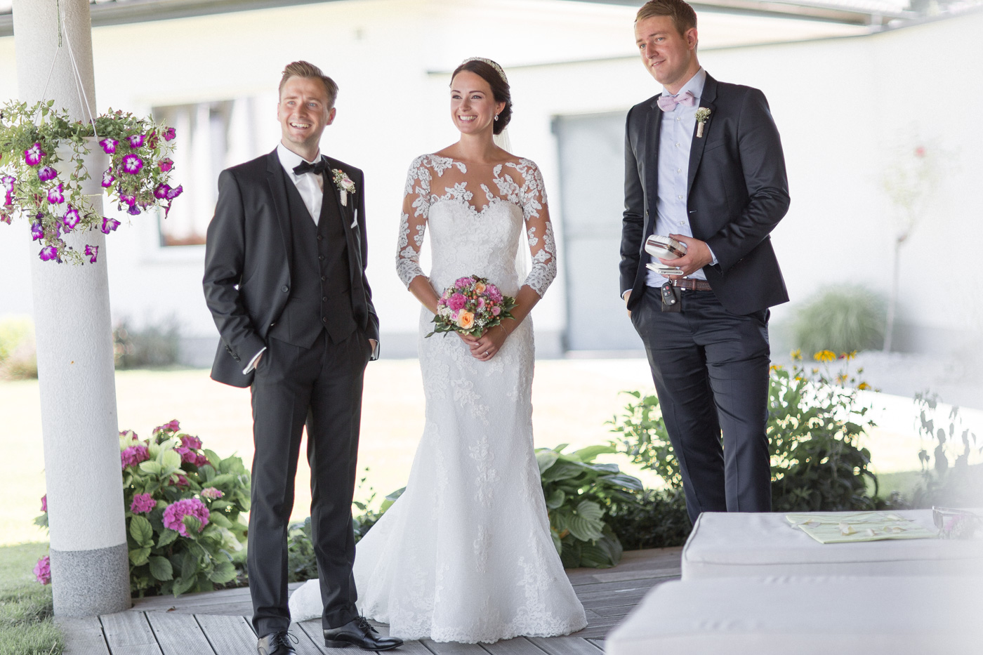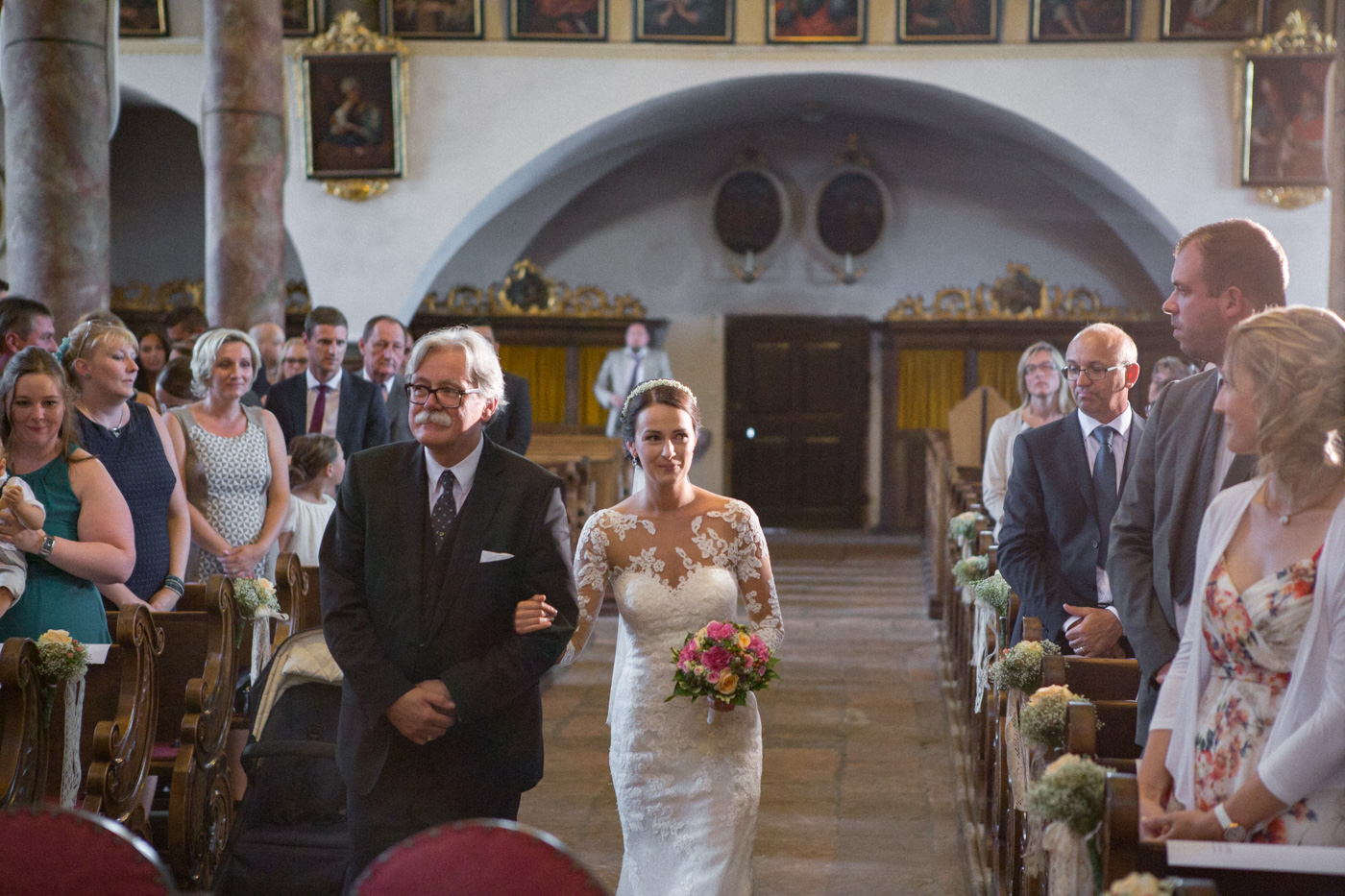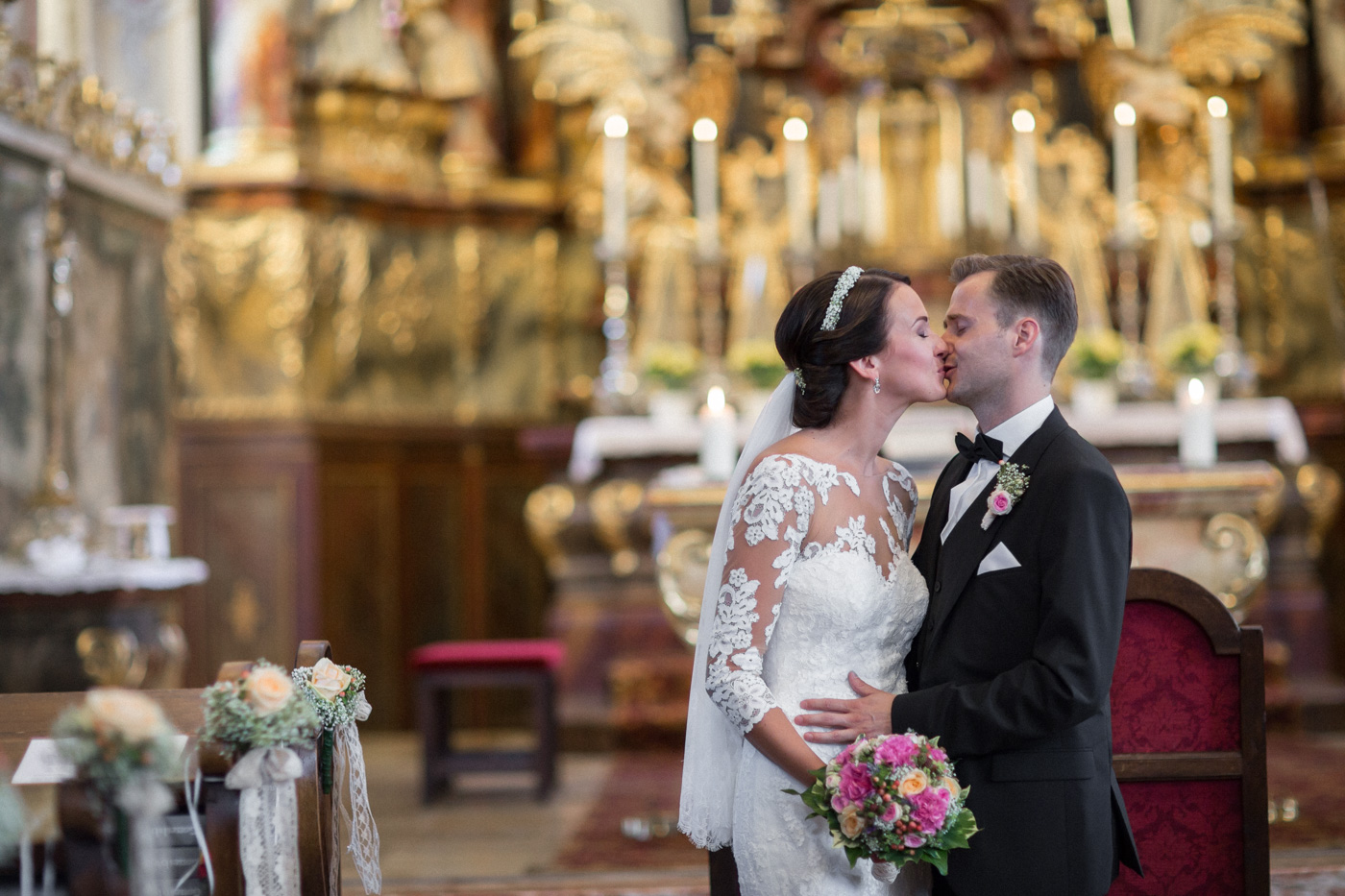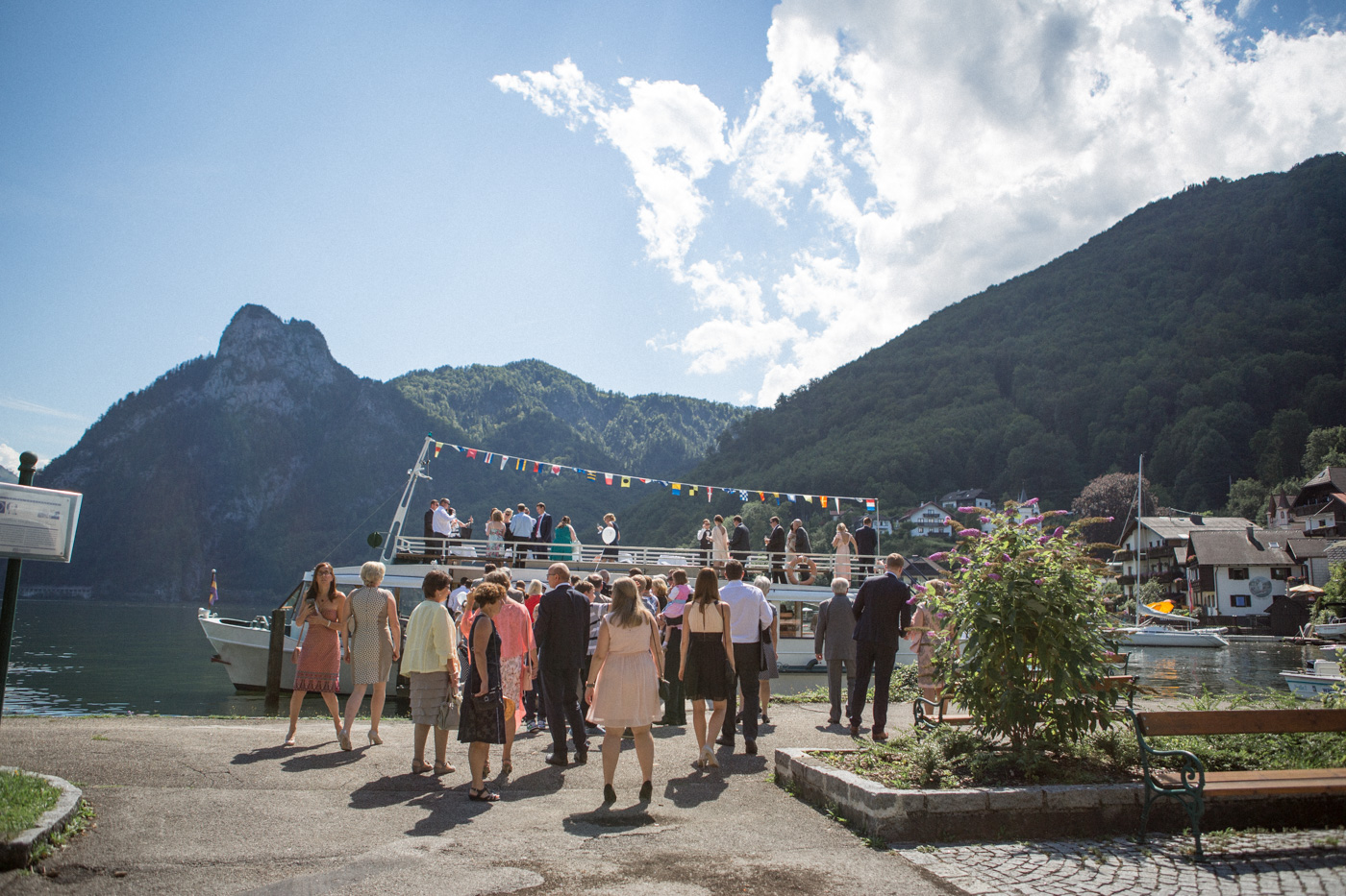 Während sich vor allem Katharina zu Hause so richtig fein und schick machte, wurden schon die Detailfotos in der Kamera festgehalten. Auf der anschließenden Fahrt nach Traunkirchen in die Kirche konnte man noch einmal ein wenig in sich gehen und vor allem die Ruhe für den anstehenden großen Moment genießen. Die Kirche war sehr berührend und emotional. Nach der Messe ging es zum Steg mit herrlichen Blick auf den See und auf den Traunstein und anschließend auf ein Schiff. Die Schifffahrt von einer Stunde wurde mit einem geselligen und schönen Sektempfang begonnen. Als das Brautpaar und die Gäste wieder ankamen, ging es dann nach Vorchdorf zum Schloss Eggenberg. Eine wunderschöne Kulisse und eine noch schönere Dekoration erwartete vor allem das Brautpaar. Die perfekte Location für Familienfotos. Diese wurden bei wunderschönem Sonnenschein natürlich auch geschossen. Eine solche Location muss natürlich auch direkt für romantische Bilder von Kathi und Patrick genutzt werden. Entsprechend haben wir auch gleich das Paarshooting realisiert. Doch dann sollten Brautpaar und Gäste erst einmal Zeit zum Feiern und essen haben. Das Schloss Eggenberg ist für Naturliebhaber eine hervorragende Kulisse. Alles ist grün und einfach ruhig. Die idealen Bedingungen für einen gemeinsamen Start in die Ehe. Aber auch Liebhaber eines kühlen Bieres werden in der hauseigenen Brauerei sicherlich auf die Kosten kommen. Ein Highlight das Schloss Eggenberg bietet, ist der Bierfassanstich für Braut und Bräutigam. Romantisch und dennoch sehr zünftig lässt es sich auf dem Schloss Eggenberg auf jeden Fall feiern.