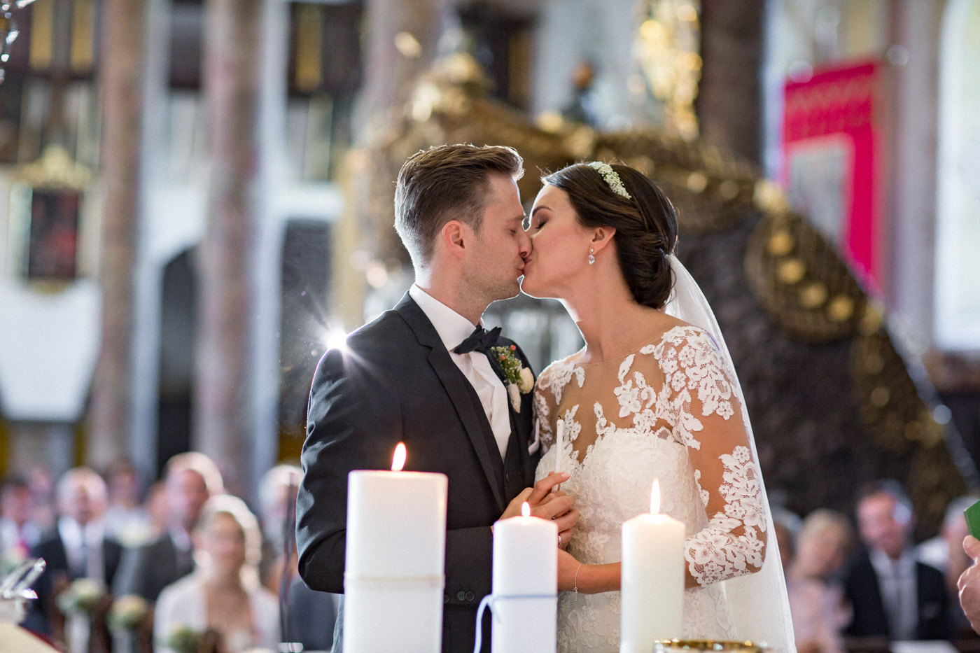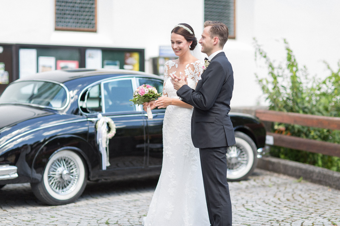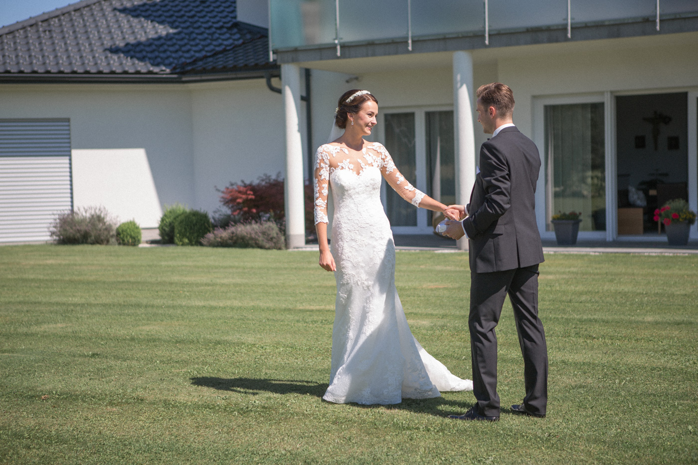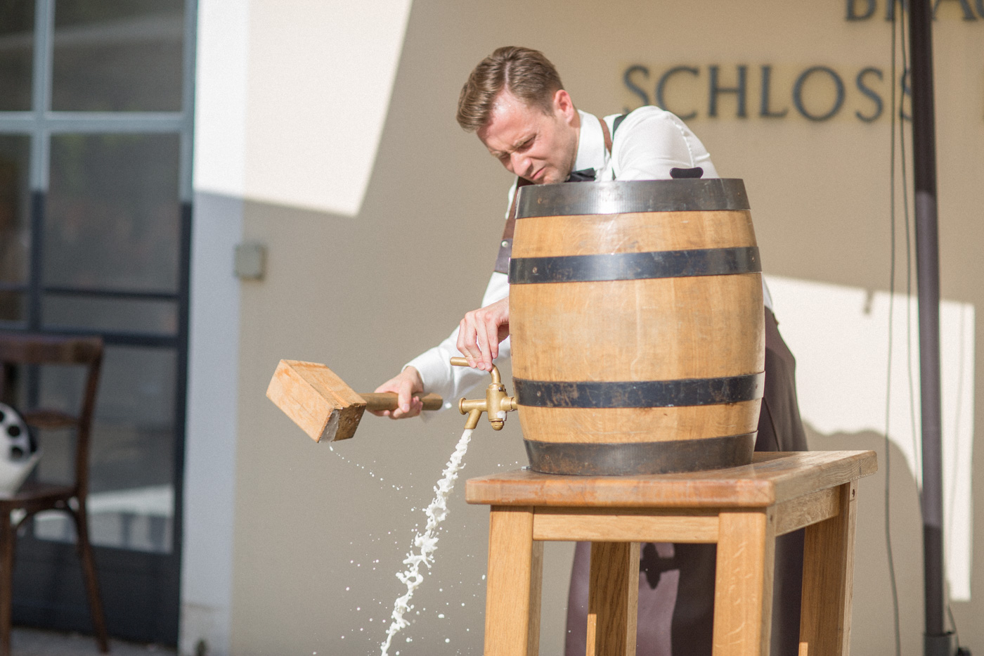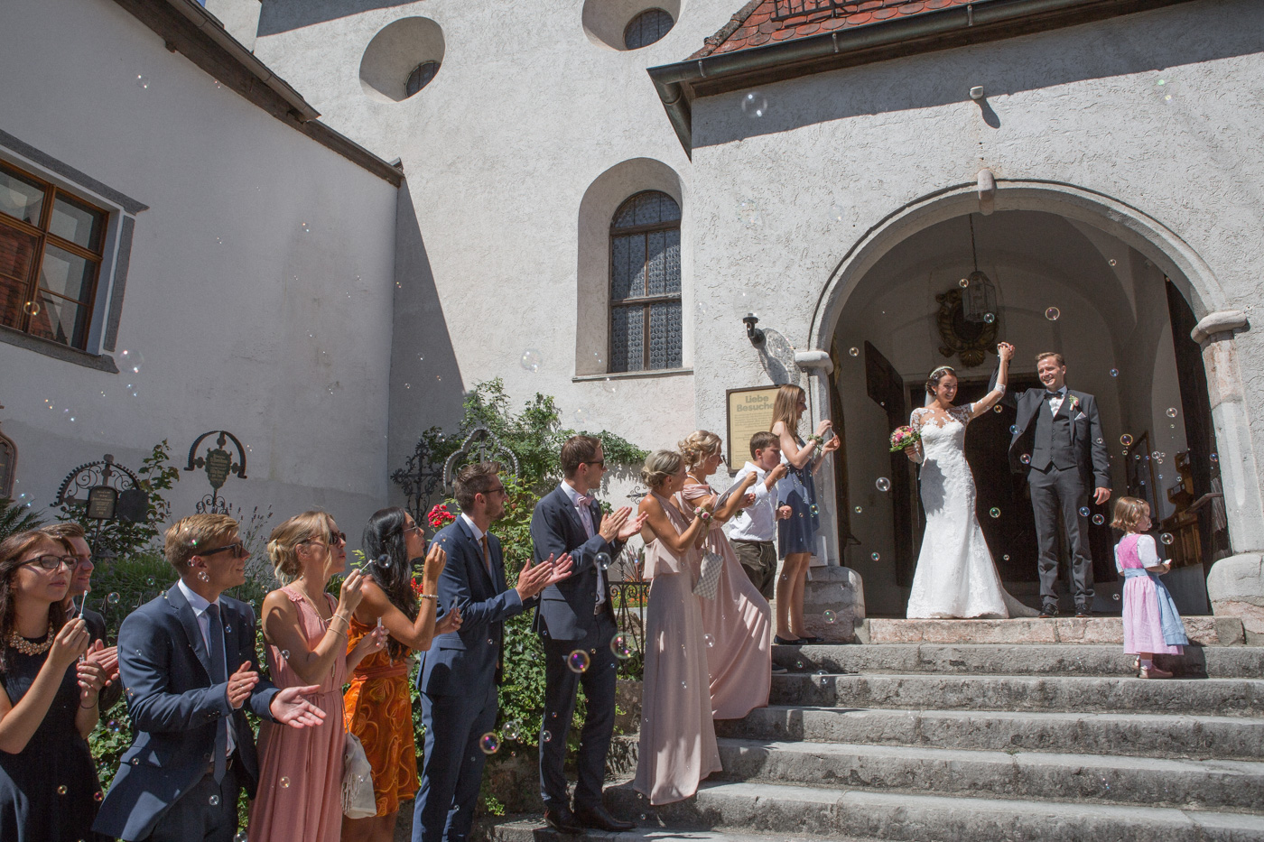 Während sich vor allem Katharina zu Hause so richtig fein und schick machte, wurden schon die Detailfotos in der Kamera festgehalten. Auf der anschließenden Fahrt nach Traunkirchen in die Kirche konnte man noch einmal ein wenig in sich gehen und vor allem die Ruhe für den anstehenden großen Moment genießen. Die Kirche war sehr berührend und emotional. Nach der Messe ging es zum Steg mit herrlichen Blick auf den See und auf den Traunstein und anschließend auf ein Schiff. Die Schifffahrt von einer Stunde wurde mit einem geselligen und schönen Sektempfang begonnen. Als das Brautpaar und die Gäste wieder ankamen, ging es dann nach Vorchdorf zum Schloss Eggenberg. Eine wunderschöne Kulisse und eine noch schönere Dekoration erwartete vor allem das Brautpaar. Die perfekte Location für Familienfotos. Diese wurden bei wunderschönem Sonnenschein natürlich auch geschossen. Eine solche Location muss natürlich auch direkt für romantische Bilder von Kathi und Patrick genutzt werden. Entsprechend haben wir auch gleich das Paarshooting realisiert. Doch dann sollten Brautpaar und Gäste erst einmal Zeit zum Feiern und essen haben. Das Schloss Eggenberg ist für Naturliebhaber eine hervorragende Kulisse. Alles ist grün und einfach ruhig. Die idealen Bedingungen für einen gemeinsamen Start in die Ehe. Aber auch Liebhaber eines kühlen Bieres werden in der hauseigenen Brauerei sicherlich auf die Kosten kommen. Ein Highlight das Schloss Eggenberg bietet, ist der Bierfassanstich für Braut und Bräutigam. Romantisch und dennoch sehr zünftig lässt es sich auf dem Schloss Eggenberg auf jeden Fall feiern.