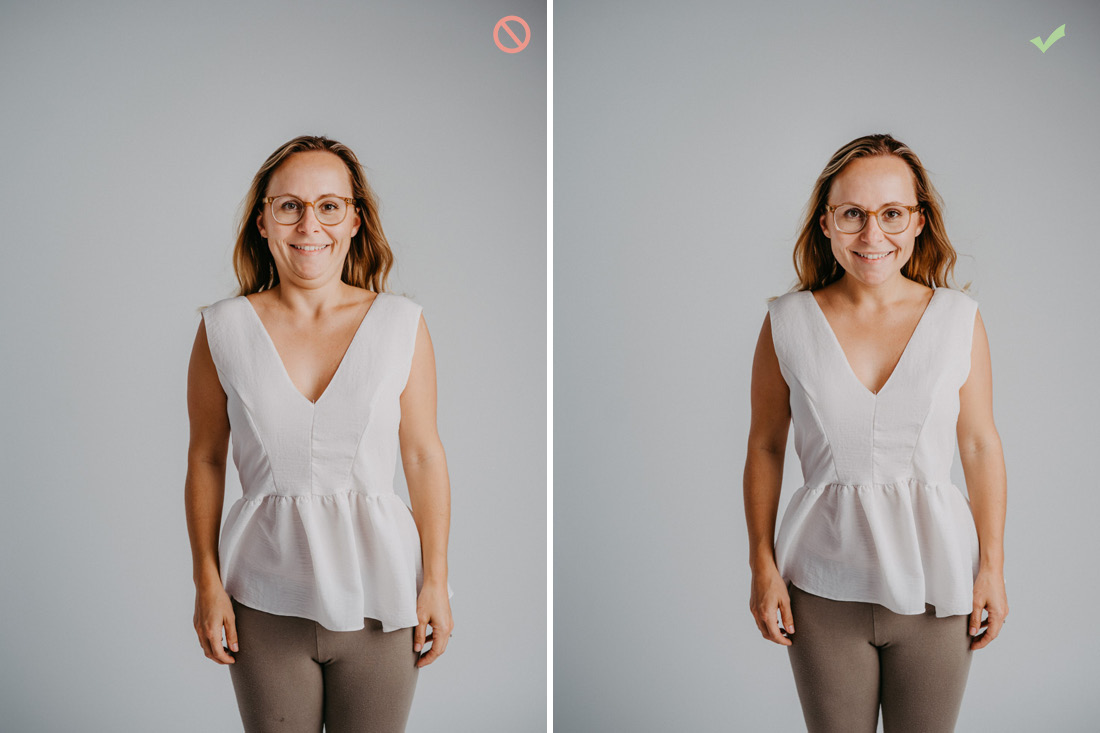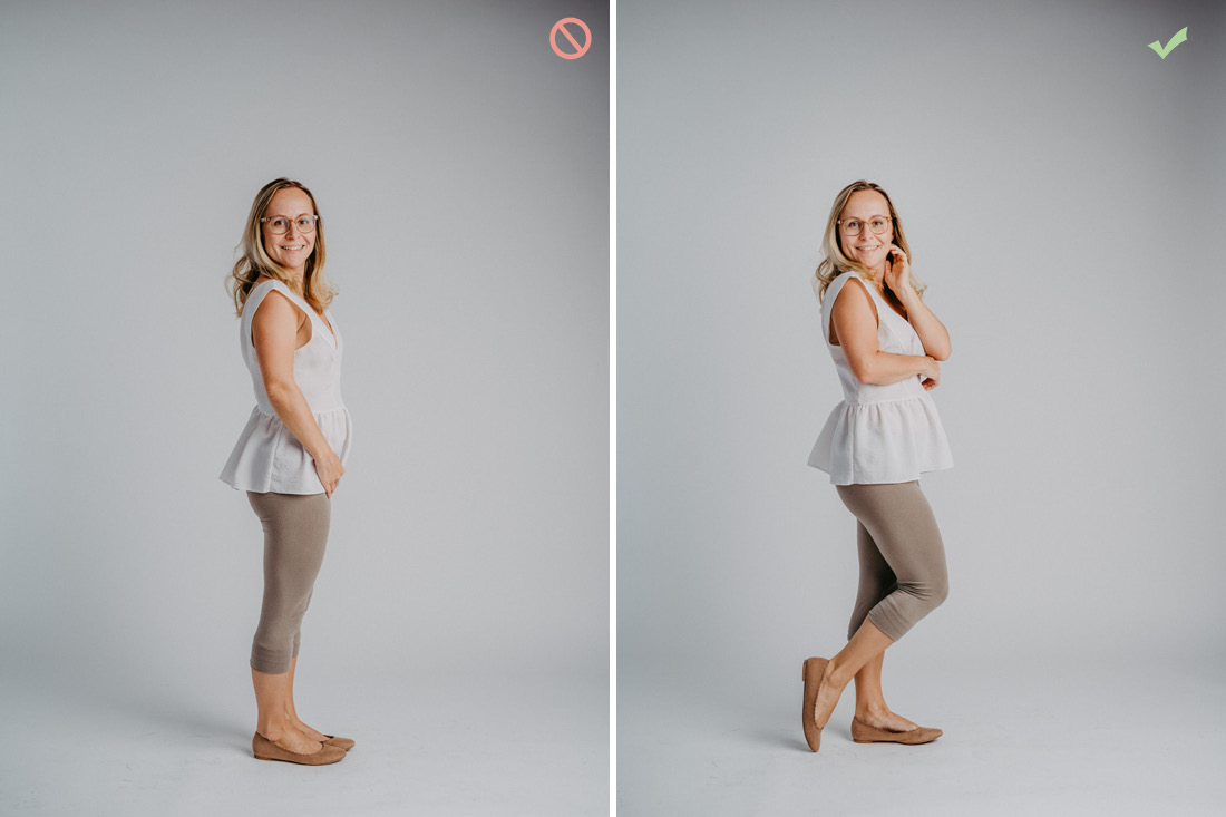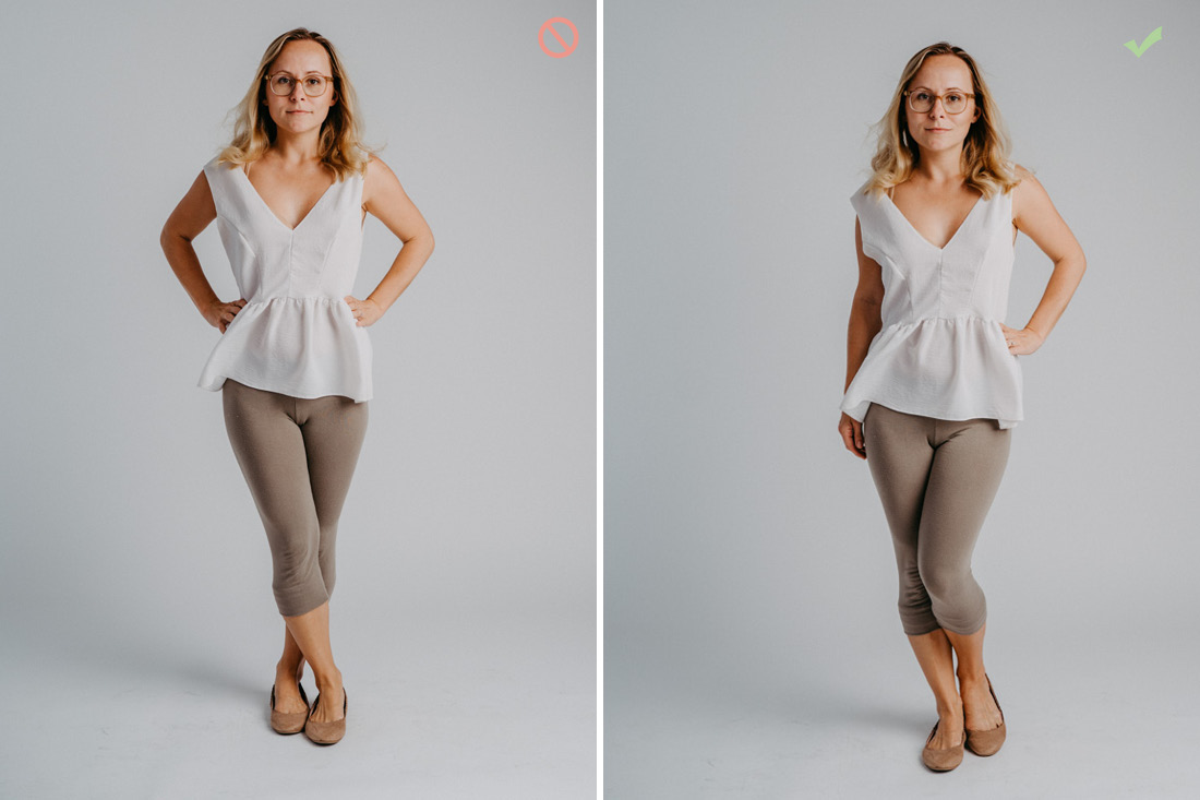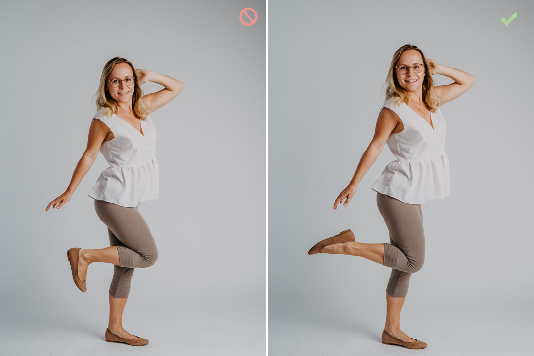 Don’t: Hände hinter dem Körper oder anderen Gliedmaßen verstecken, denn das wirkt so als wären sie abgeschnitten. Gebückte Körperhaltung und Beine auf gleicher Höhe.